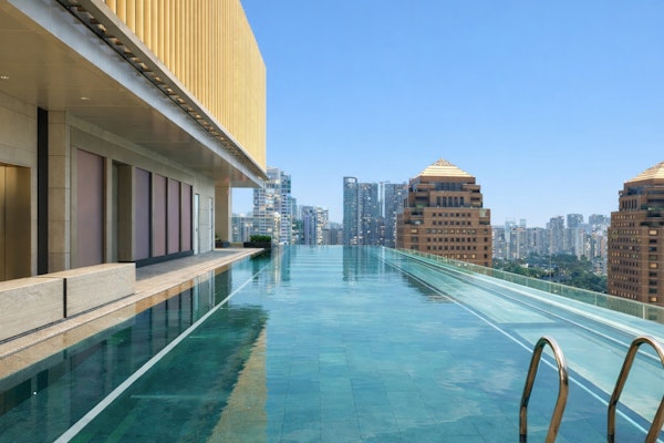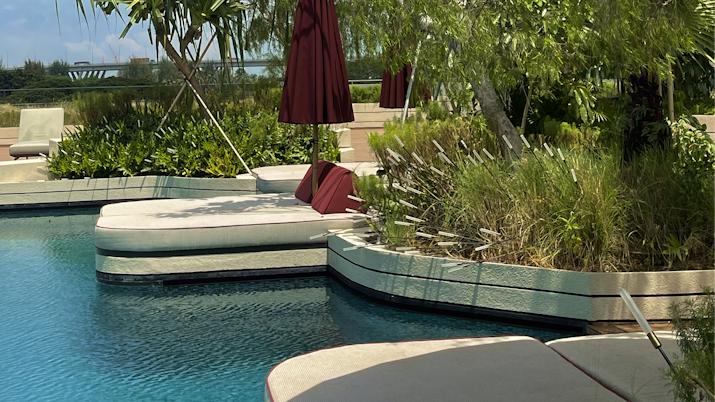 The pool itself is large and surrounded by greenery, with around 15 sunbeds spaced out enough that it never feels crowded. Even though you’re in the city, it feels slightly removed from it. You still get the skyline, but softened.
